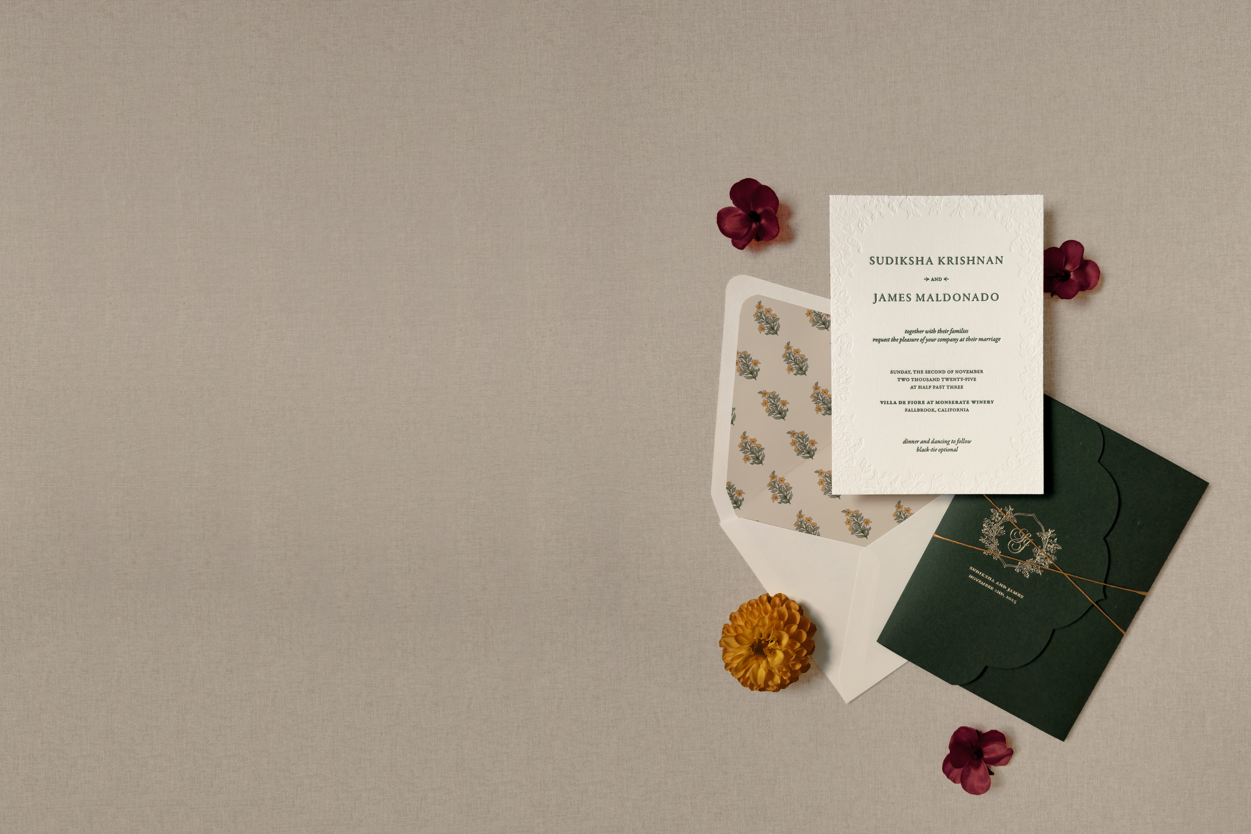 Wedding decisions add up quickly, and paper is often where timing, etiquette, and design first collide. We bring calm structure to it all, so every choice feels clear and the experience feels effortless. Your project is led by Creative Director Sudiksha Krishnan, a RISD-trained designer with award-winning branding work for Fortune 500 clients, now bringing that same rigor and taste to one-of-a-kind stationery and signature artwork. You’ll feel supported throughout, with a finished suite that feels cohesive, elevated, and entirely your own.