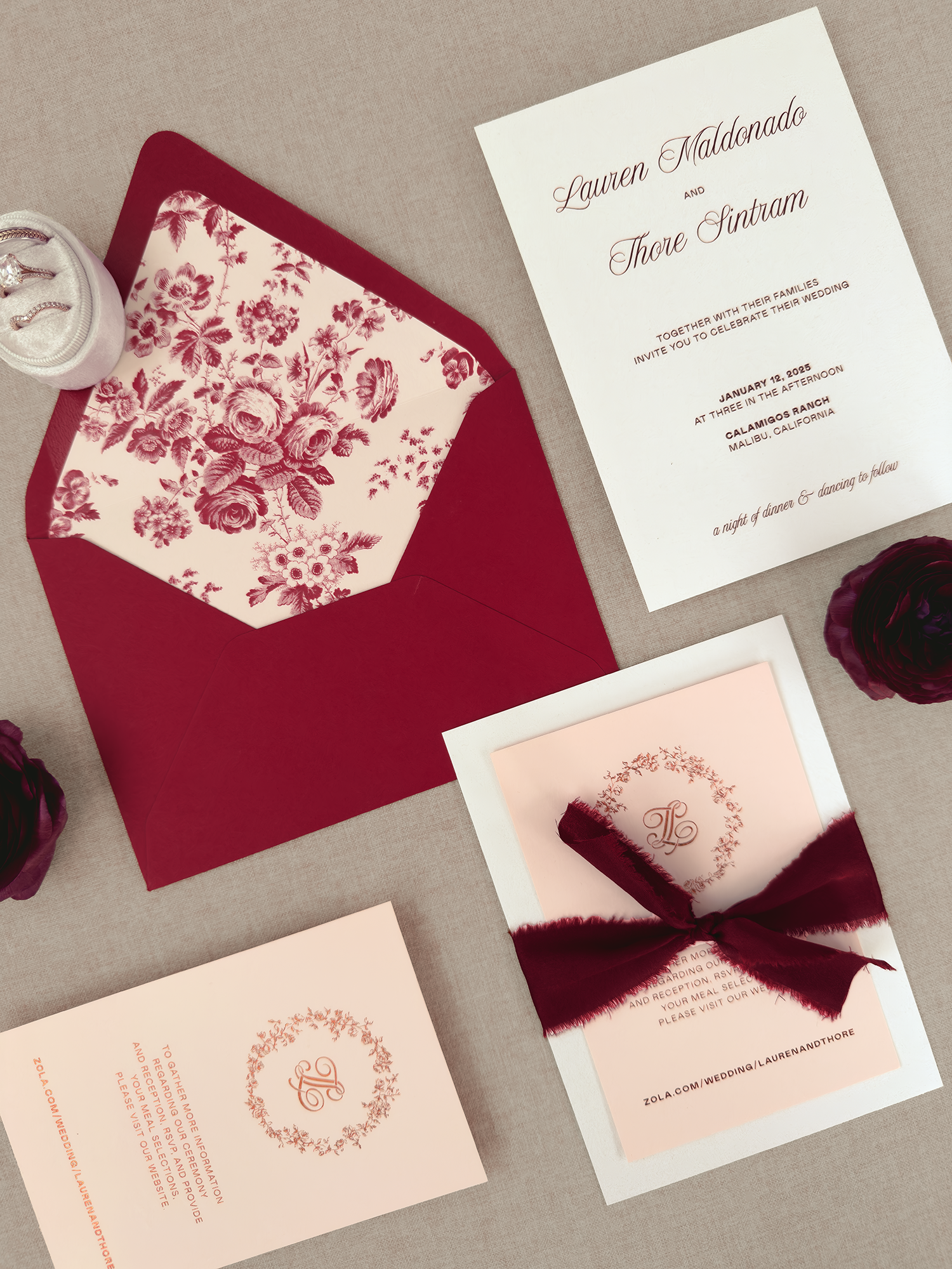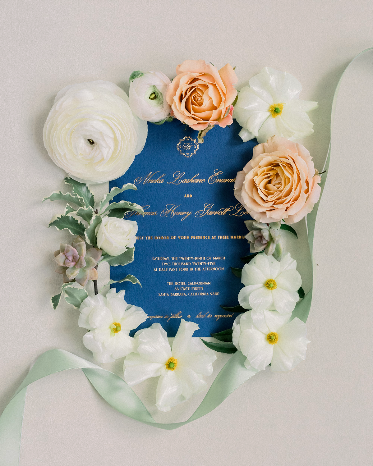 Bespoke invitation suites with elevated paper, typography, and finishes. Save the dates available as an add-on.