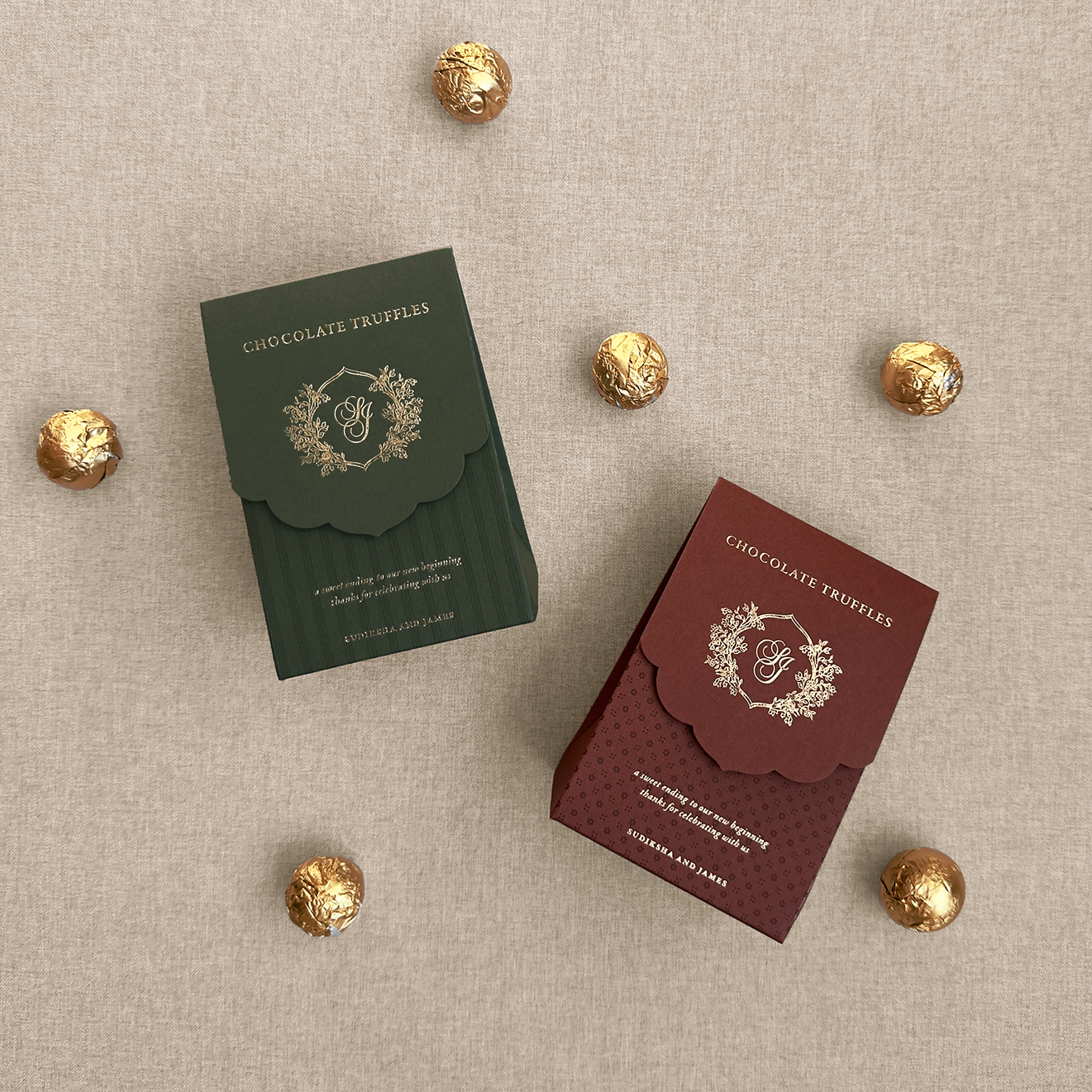 Day-of paper, signage, vow books, and favor packaging designed to echo your suite and make everything seamless.